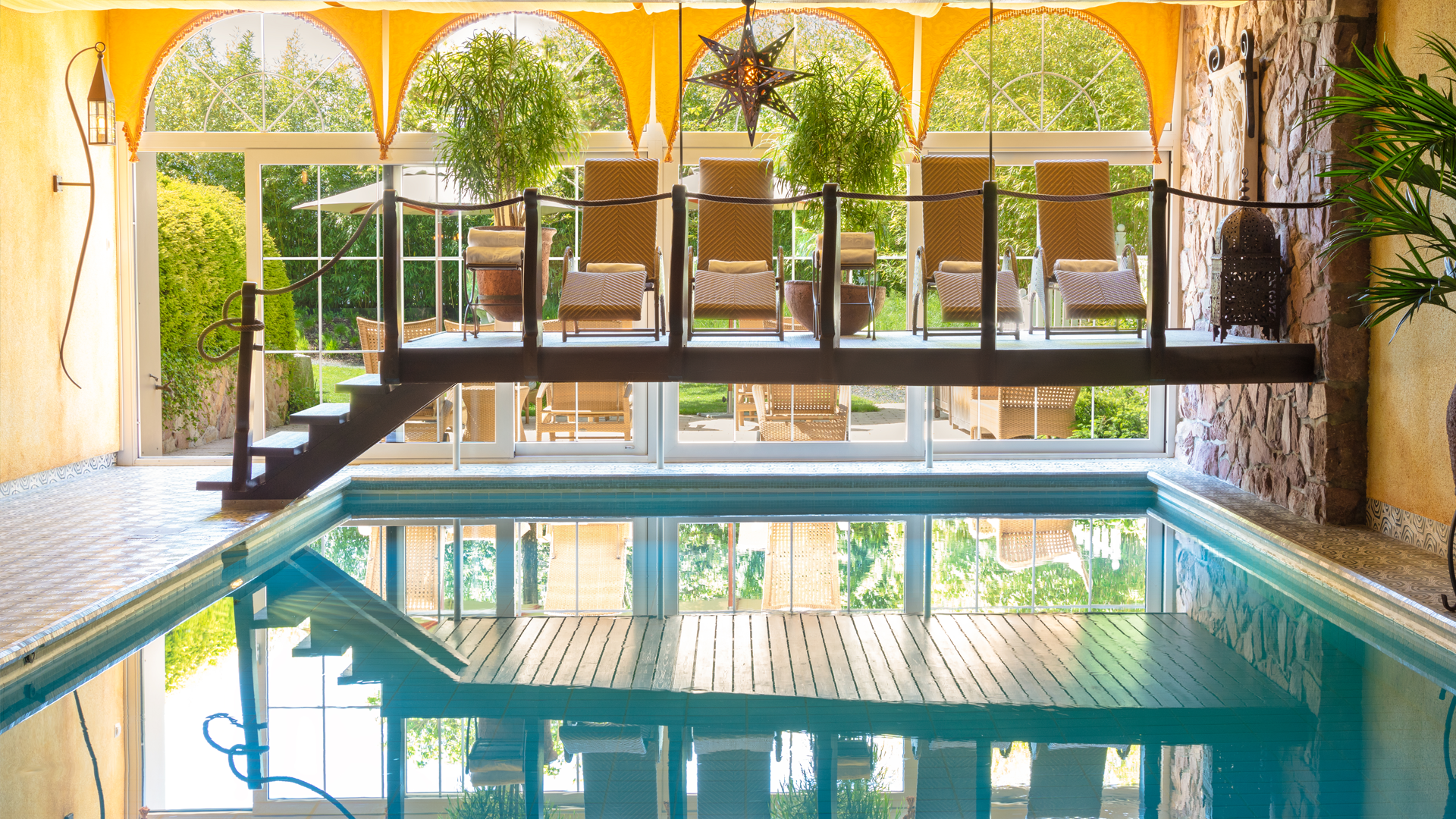 In unserer orientalisch gestalteten Wellness-Oase empfangen wir Sie zur Entspannung im Quellwasser-Schwimmbad (28 - 31°C),der Finnischen Sauna mit funkelndem Sternenhimmel, Infrarotkabine oder zu wohltuenden Massagen.